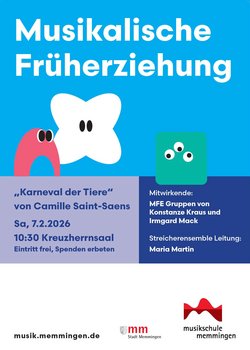 Am 7.2.2026 laden die jüngsten Schülerinnen und Schüler aus der Musikalischen Früherziehung von Irmgard Mack und Konstanze Kraus zum „Karneval der Tiere“ um 10:30 Uhr in den Kreuzherrnsaal ein.