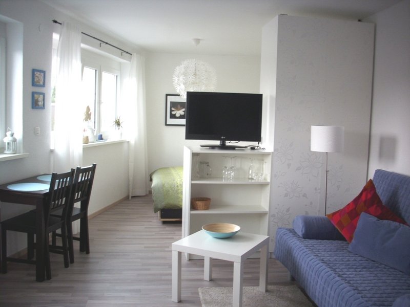 Zwei modern eingerichtete Apartments, jeweils mit einem Bett 1,40/1,60 m breit (+ Schlafsofa), voll ausgestattete Küche, Dusche und WC. Nutzung von Waschmaschine und Trockner möglich. Verkehrsgünstig gelegen, nahe Autobahnkreuz A 7 und A 96. Kurze Anfahrt zum Flughafen. Längerfristige Vermietung möglich.
