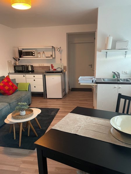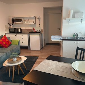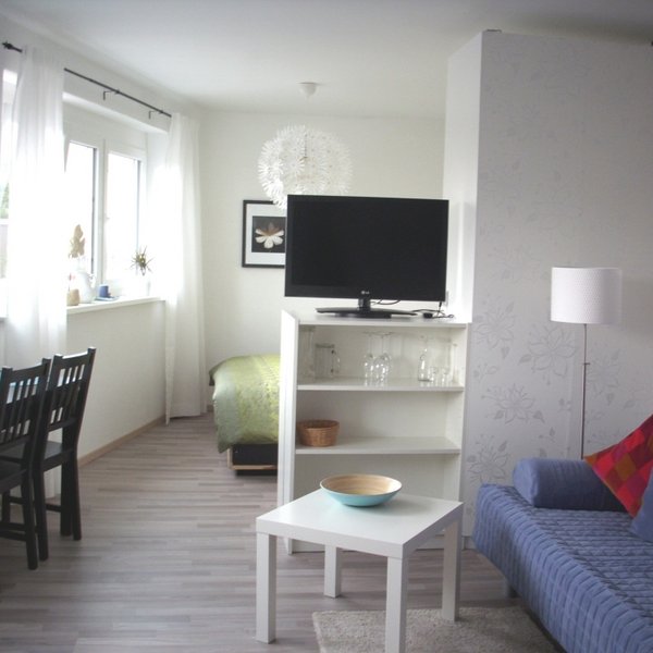 Two modernly furnished flats, each with a bed doube/small double bed (+ sofa bed), fully equipped kitchen, shower and toilet. Use of washing machine and dryer is possible. The flats are conveniently located, close to the A 7 and A 96 motorway intersection. Short drive to the Allgäu Airport. The flats can be rented for longer periods.